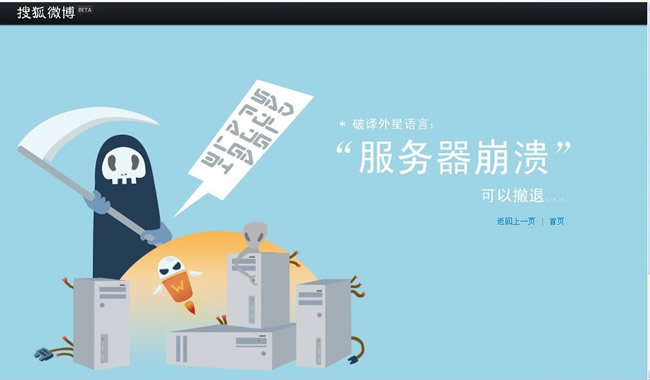 這個是搜狐微博的?芍^是意外的發現,早上點微博的時候出現的。真是充滿了中國神話的色彩,一方面用死神代表服務器出現了問題,另外一方面用一堆看不懂的符號來表示外星語言,旁邊加上注釋“服務器崩潰,可以撤退……”碰上這兩個家伙,真是應當馬上撤退呀!