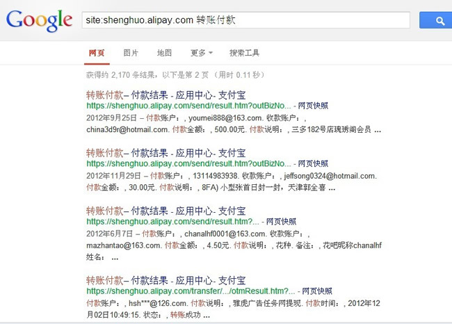 根據騰訊新聞昨日22:34分信息,支付寶被爆用戶的付款轉賬信息被谷歌抓取,大量的用戶隱私被泄露。筆者今天早上上班看到此文,在上午10時左右親身試驗了一下,在谷歌中搜索“付款轉賬”“支付寶轉賬”相關關鍵詞時并沒有出現文中所述的信息,但當筆者使用SEO常用命令“site:shenghuo.alipay.com(支付寶應用中心頁面)+付款轉賬”搜索時,果然搜索出2170條結果,如下圖: