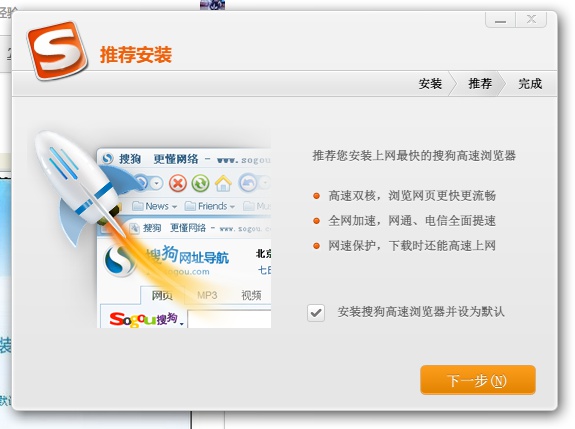 搜狗的安裝頁面,我一定是看花眼了,不然以搜狗在流氓界這么大的知名度,怎么可能就捆綁一個(gè)瀏覽器就放過了我們?唔,這背后一定還隱藏著什么驚天大陰謀!